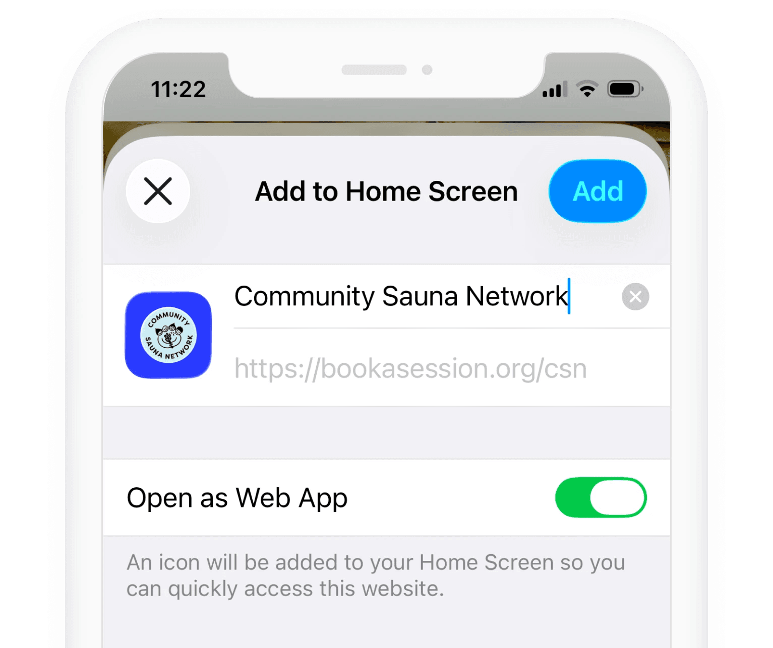 Check that the URL shown is your booking page. If it looks wrong, go back, refresh, and try again. Make sure the Open as Web App toggle is switched on — this lets Session open in its own window, without Safari's address bar. Tap Add to finish.